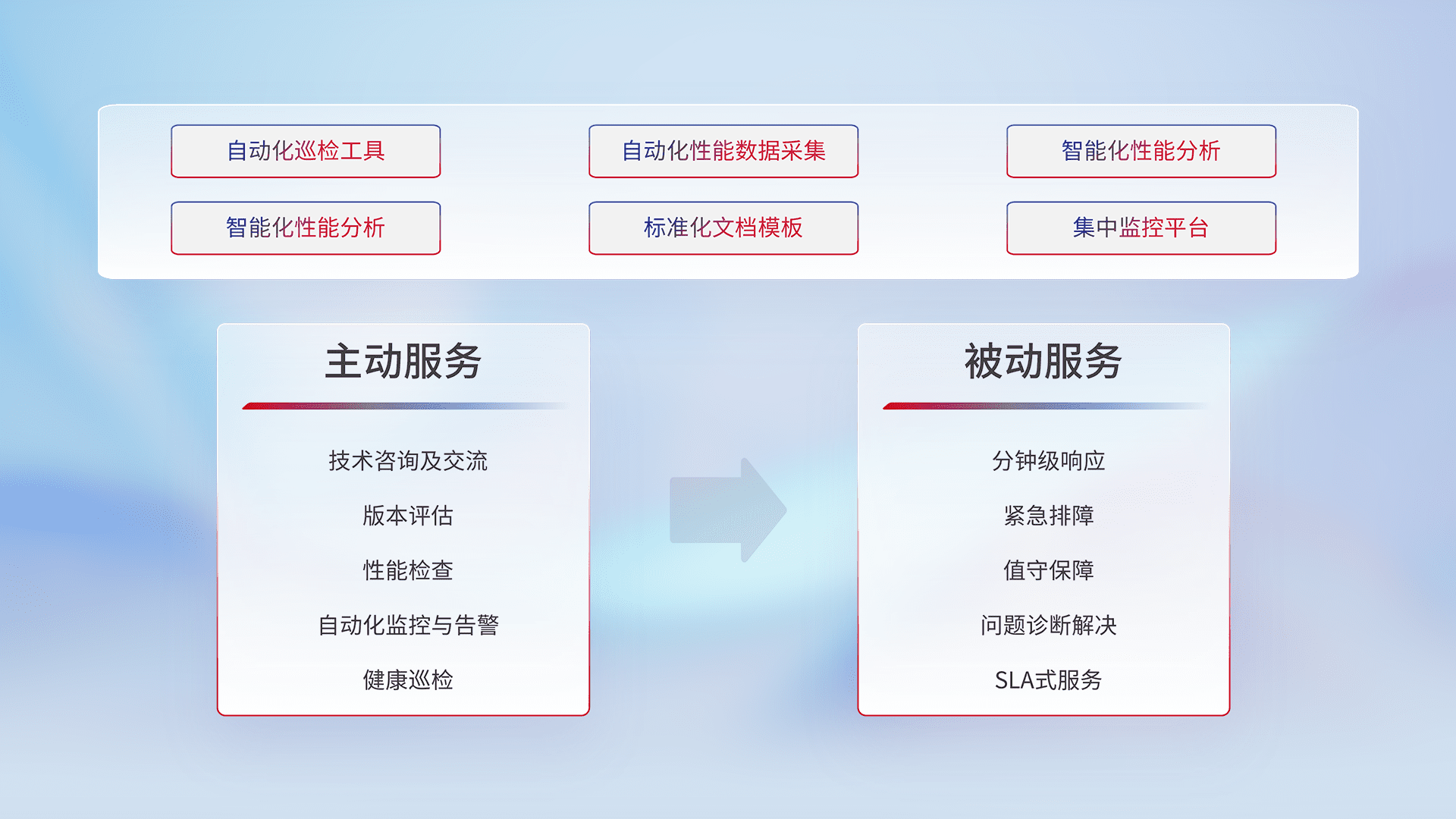 智能化工具和标准化文档,,,保障服务质量,,,,提供主动服务(包含技术咨询、、、、版本评估、、、、性能检查、、、自动化监控与告警、、健康巡检)和被动服务包含(分钟级响应、、、、紧急排障、、、值守保障、、、问题诊断解决、、SLA服务)。。。